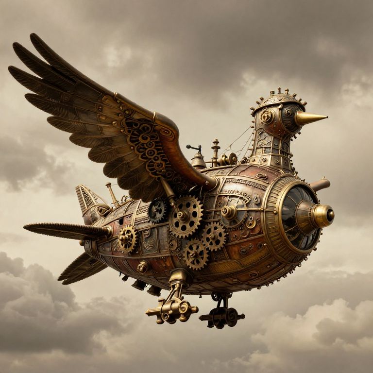 Steampunk bird aircraft with brass gears, copper pipes, and wings, flying against a cloudy sky. Detailed, mechanical design. Digital art.