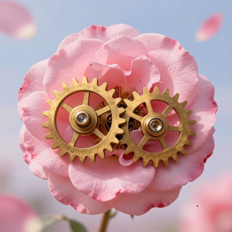 A close-up photograph of a pink rose with delicate, layered petals. Inside the center of the rose, two golden gears are intertwined, their cogs partially overlapping. The gears are metallic and shiny, contrasting with the soft texture of the rose petals. The background is a clear blue sky with blurred pink rose petals floating in the air, adding a dreamy, whimsical touch. The image combines natural beauty with mechanical elements, creating a surreal, steampunk-inspired effect. The lighting is bright and natural, highlighting the rose's vibrant pink color and the golden hues of the gears.