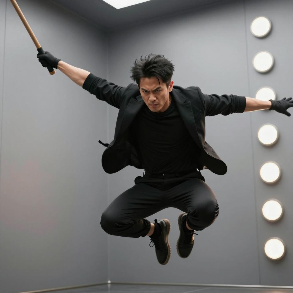 Asian man with black hair, black clothing, and gloves, mid-air, arms outstretched, holding a stick, in a metallic room with vertical lines and round lights on the right. Intense facial expression. High-speed motion effect on the left.
