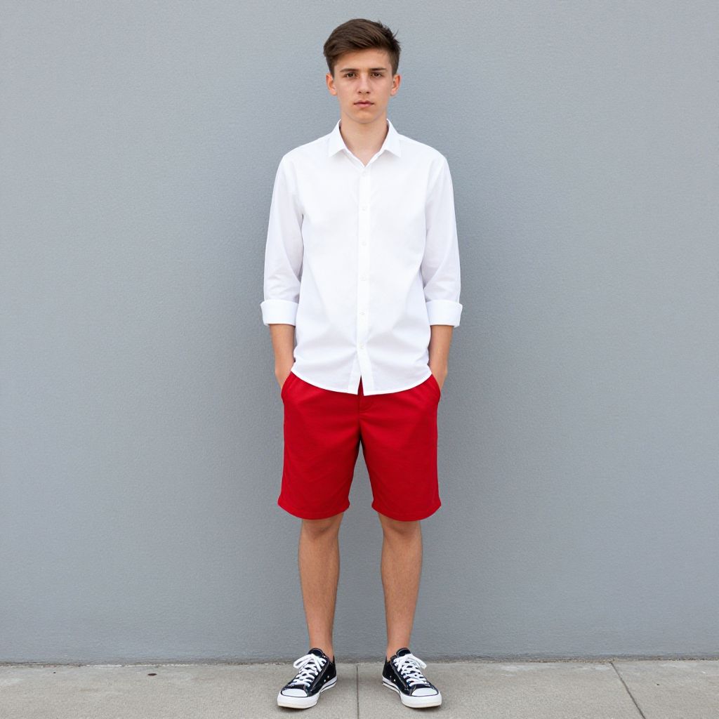 Photograph of a young man standing against a plain gray wall. He has short, dark brown hair and fair skin. He wears a crisp white long-sleeve button-up shirt with the sleeves rolled up, bright red knee-length shorts, and black and white low-top sneakers. His hands are casually placed in his pockets. The floor is concrete, and the overall style is casual and modern. The image has a slightly stylized, almost graphic look with bold colors and sharp contrasts.