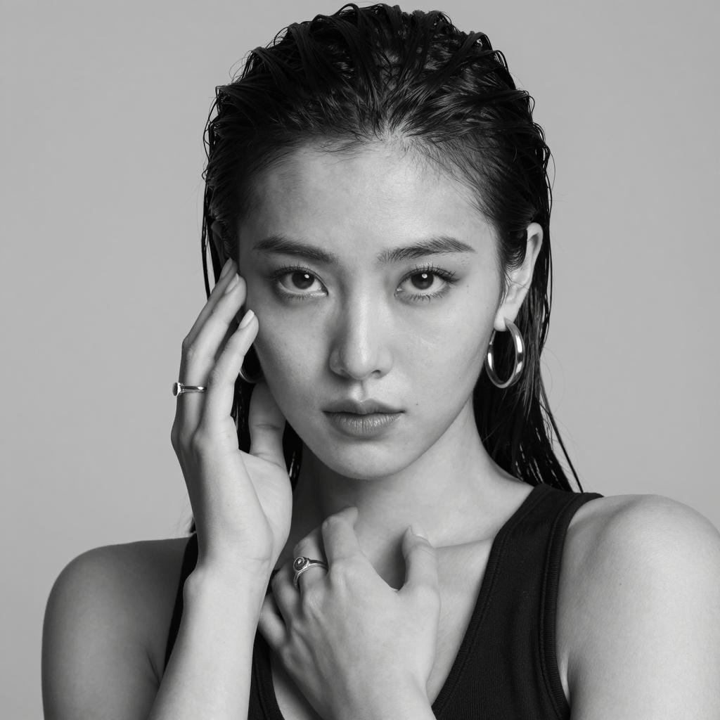Black and white photo of a young woman with dark, wavy hair in a messy bun. She has fair skin, large expressive eyes, and full lips. She is bare-shouldered, with one hand gently touching her collarbone and the other hand resting on her neck. Her eyebrows are thick and well-defined. Her gaze is direct and slightly intense. She wears small stud earrings and a simple ring on her right hand. The background is plain and gray.