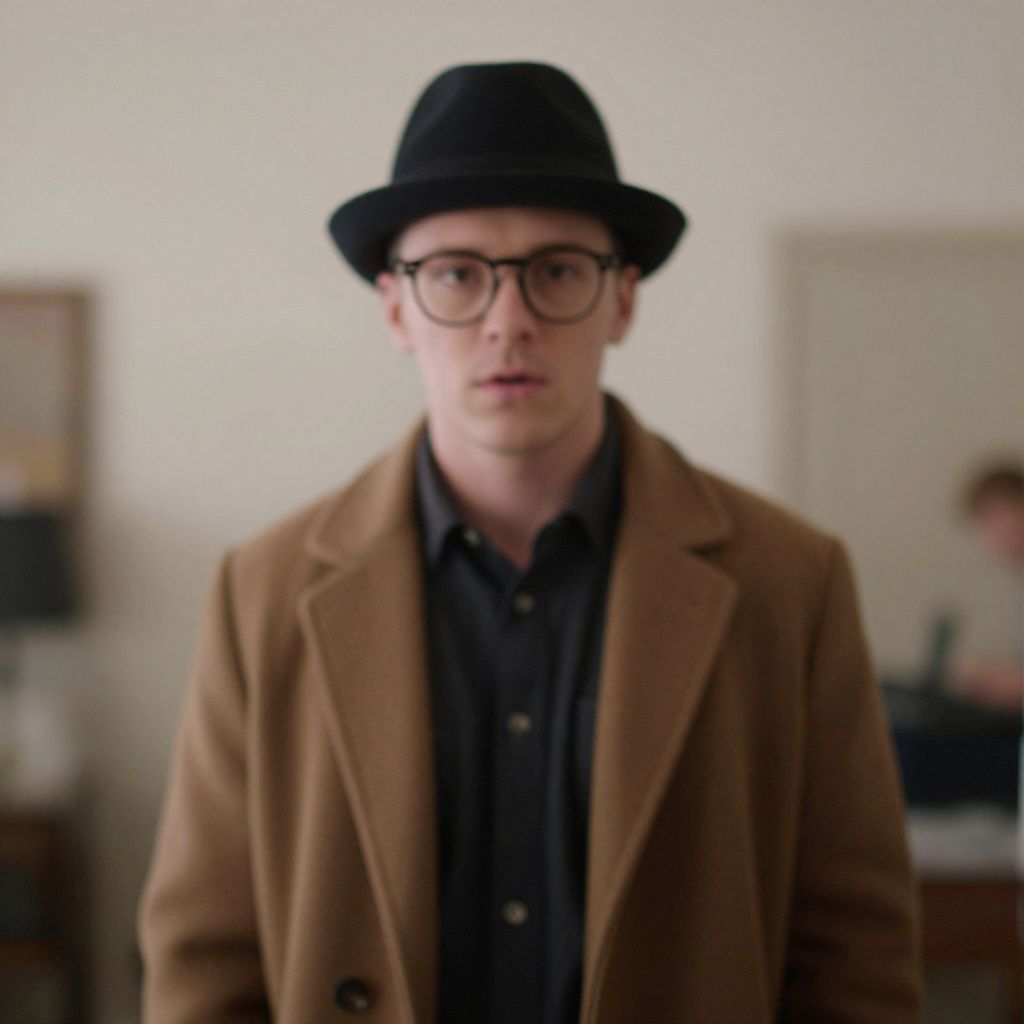 Party outfit, 1boy, male focus, solo, glasses, hat, coat, blurry, old