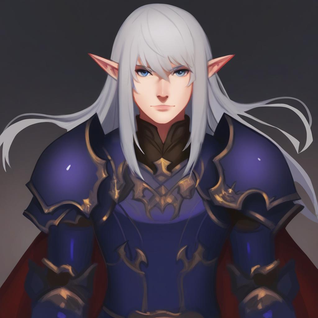 Digital illustration of a fantasy warrior character inspired by Estinien Varlineau from Final Fantasy. The character has long white hair, striking blue-gray eyes, and elven features with pointed ears. He is wearing detailed dark blue and gold armor with pauldrons and a dark cape, set against a muted background.