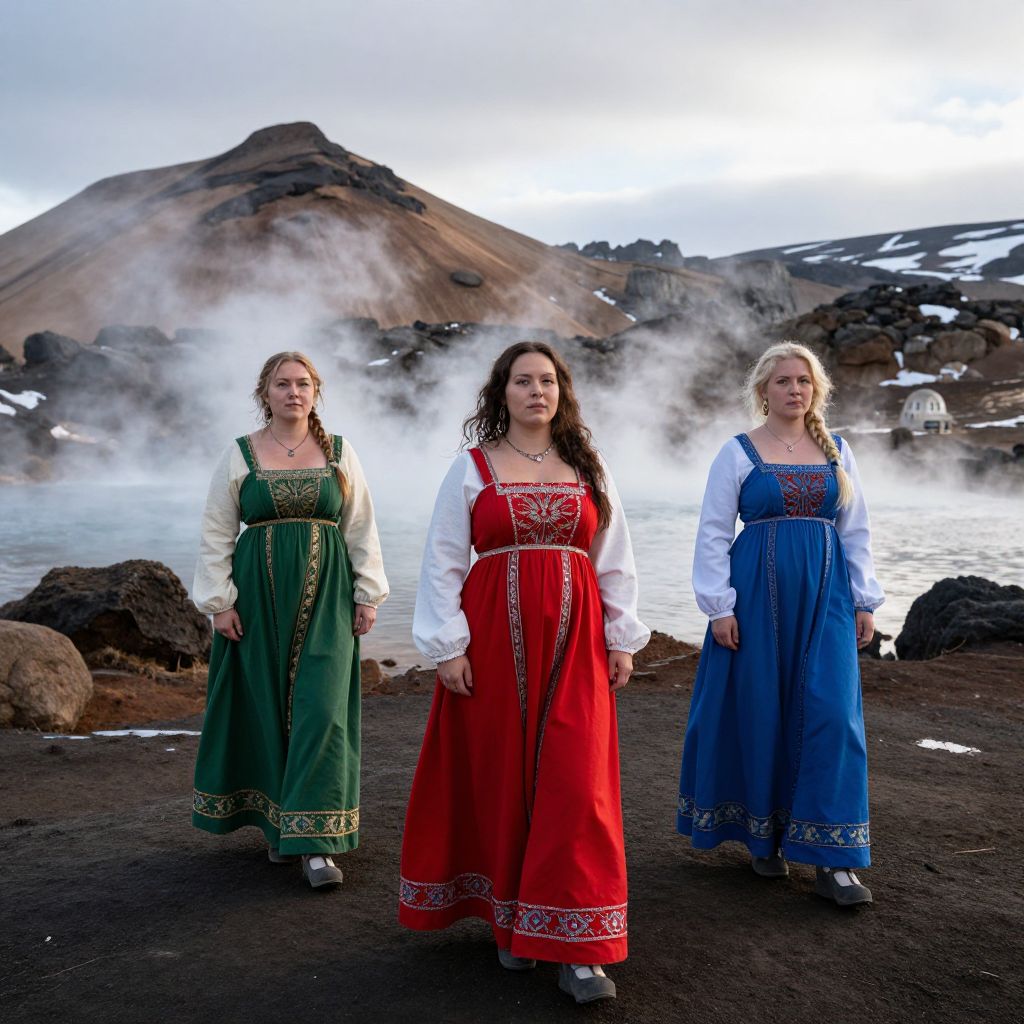 Busty Icelandic women in flowing dresses inspired by Icelandic folklore, set against a backdrop of volcanic mountains and gently steaming hot springs, embodying a blend of mythology and natural grandeur with cinematic lighting and vibrant colors.