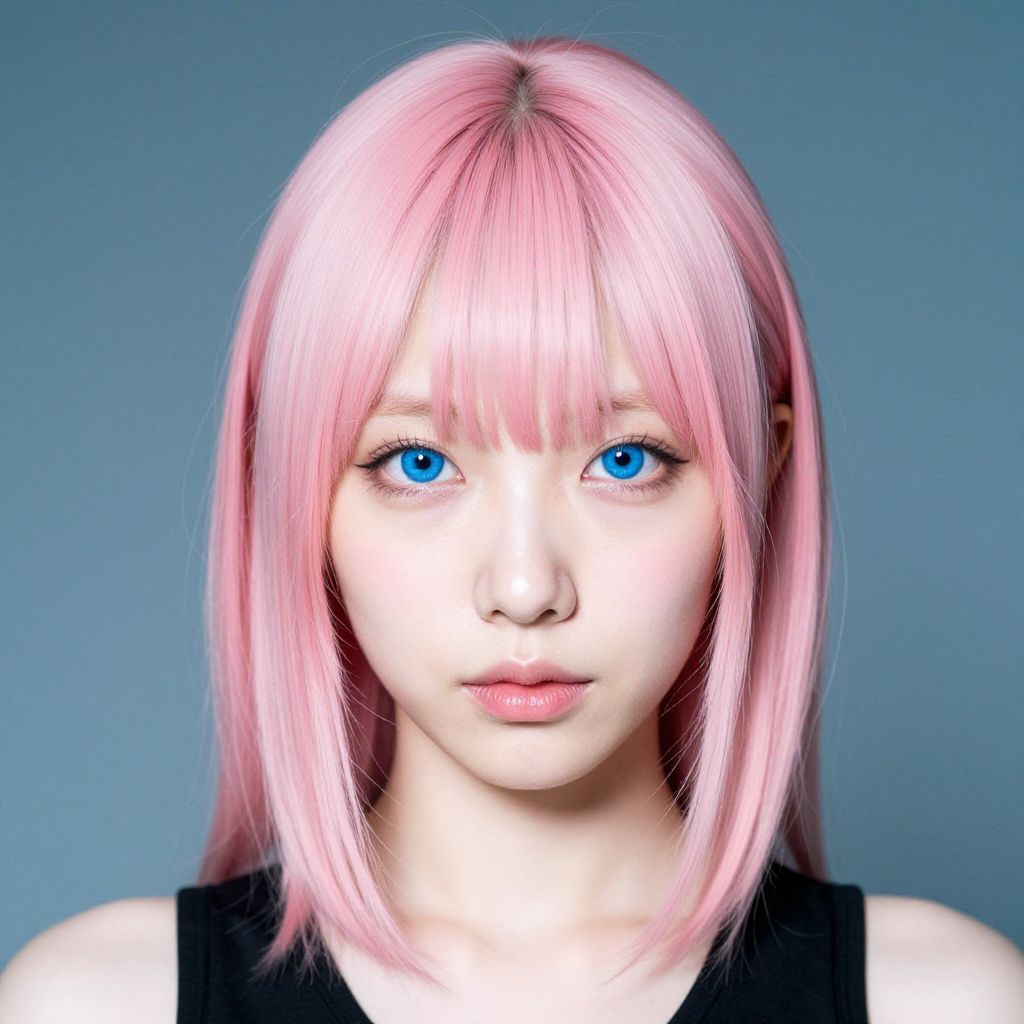 Blue Idoru. Petite and slender Japanese woman. Dark blue hair in twin-tails. Blue eyes. Photorealistic face. Detailed facial features. She is blowing a huge bubble from bubble gum that is half the size of her head.