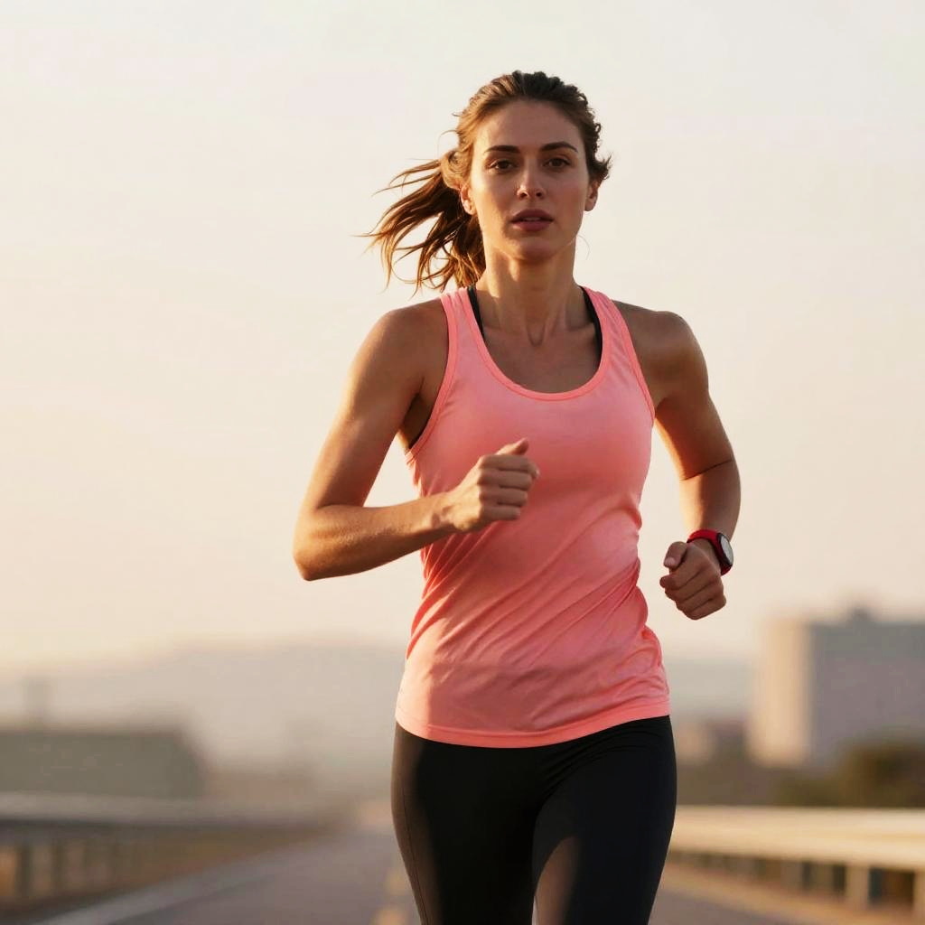 Photograph of a fit, young woman with light skin and brown hair in a ponytail, running through a lush green field. She's wearing a bright red sports bra and matching red shorts, with white athletic shoes. The background shows a blurry blue sky and distant trees, suggesting an outdoor, sunny location. She's mid-stride, smiling, and looking forward.