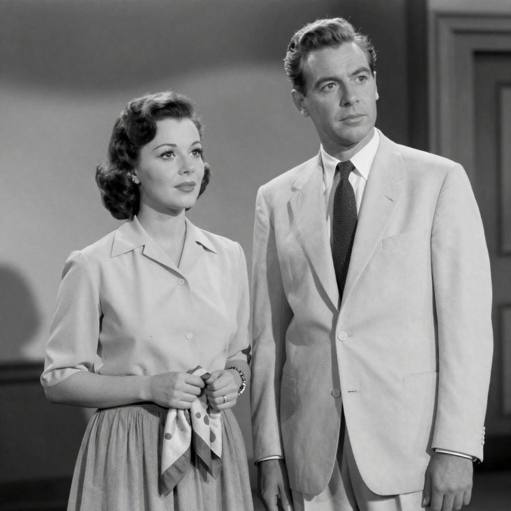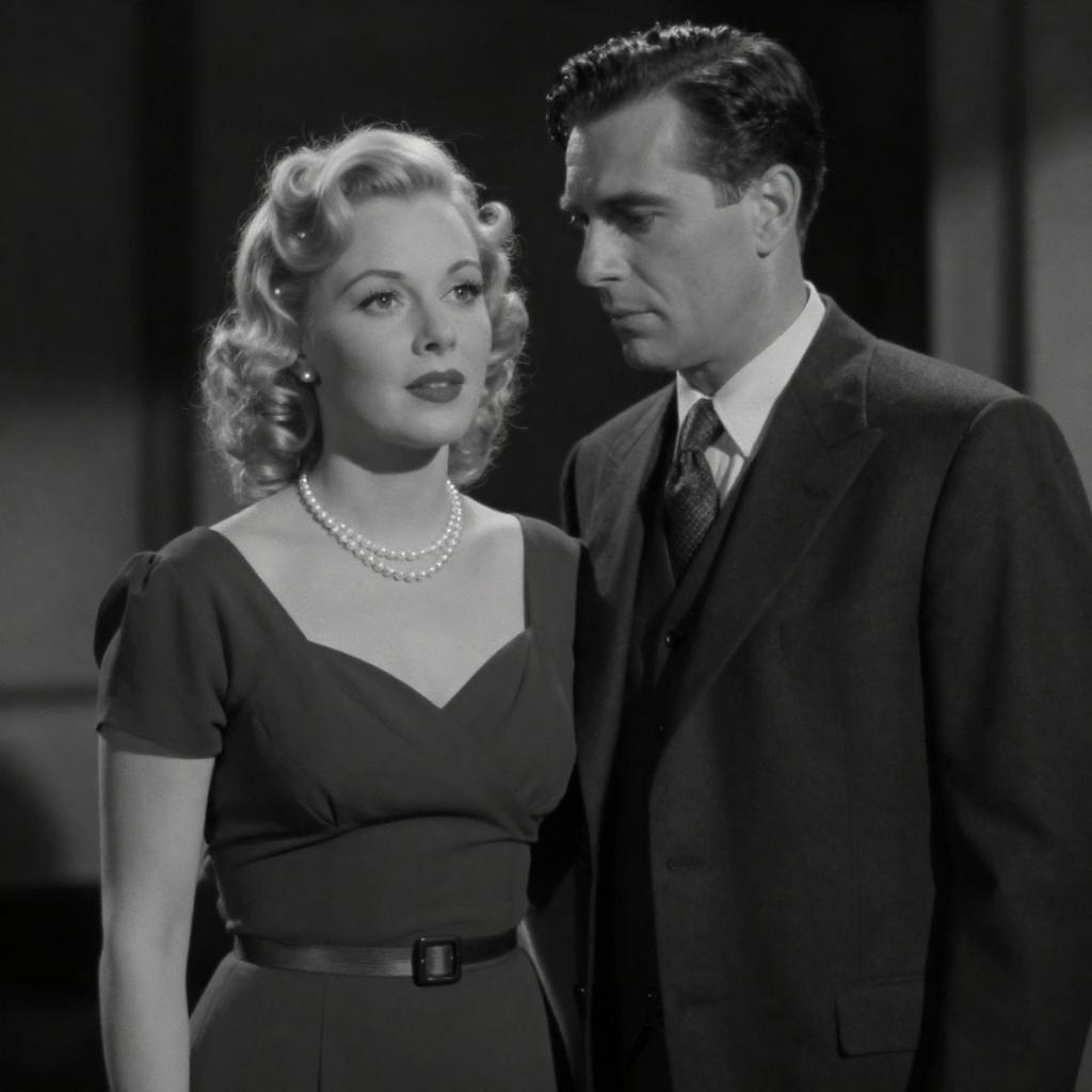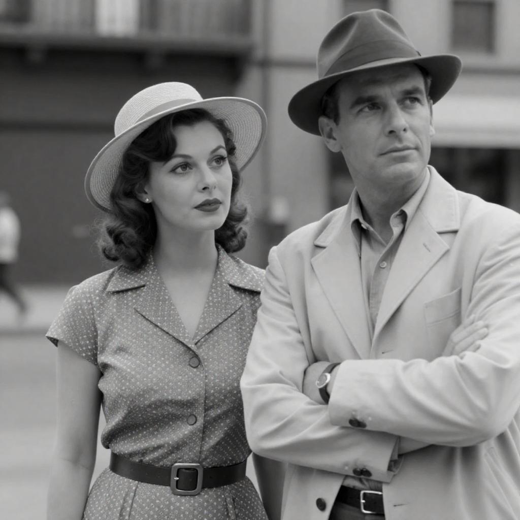 Black-and-white photograph of a 1940s-style couple. The woman, with fair skin and dark hair, wears a patterned dress and wide-brimmed hat, looking to the left. The man, with fair skin and dark hair, wears a fedora and light jacket, standing with arms crossed, looking forward. Background shows a blurred urban setting.