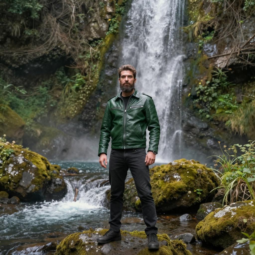 A bearded man wearing a green leather jacket and dark pants stands confidently in front of a scenic waterfall. The surrounding environment features lush greenery and moss-covered rocks, with a stream flowing through the rocky terrain. The natural setting is vibrant and serene, highlighting the rugged beauty of the location.