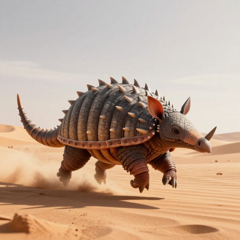 A computer-generated 3D render depicts a fantastical armored creature resembling an ancient armadillo, sprinting across a desert landscape with dramatic lighting and high-definition detail, as its spiked tail loops behind, evoking a sense of timeless motion and mythical adventure.