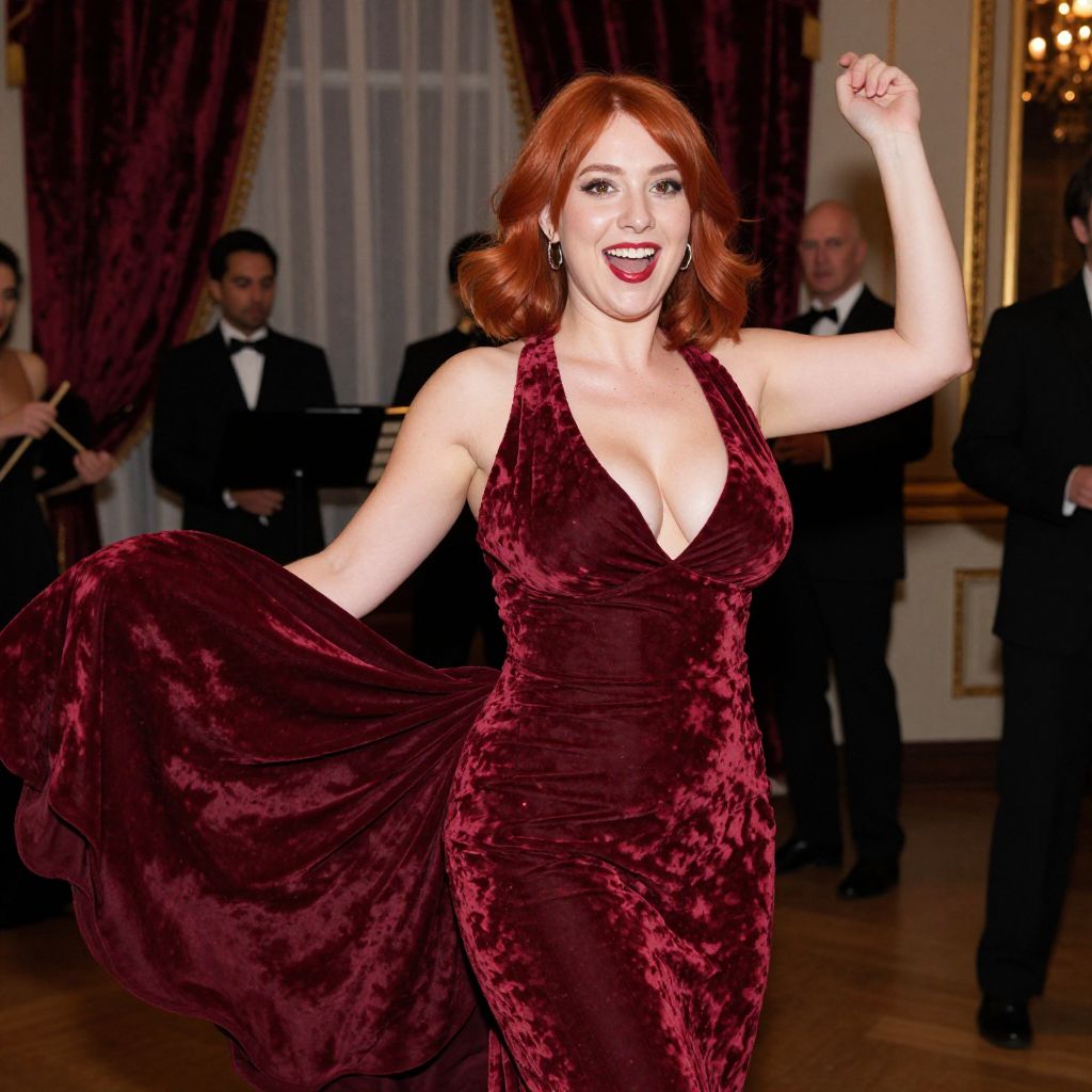 A bold and confident woman with fiery red hair and almond-shaped hazel eyes wearing a dramatic velvet dress party wear in deep crimson with a plunging neckline and flowing train, dancing during a high-end charity gala in a grand Victorian-style venue with velvet drapes and live music in the background, eyes sparkling with joy and excitement.. The woman has big breasts and cute face