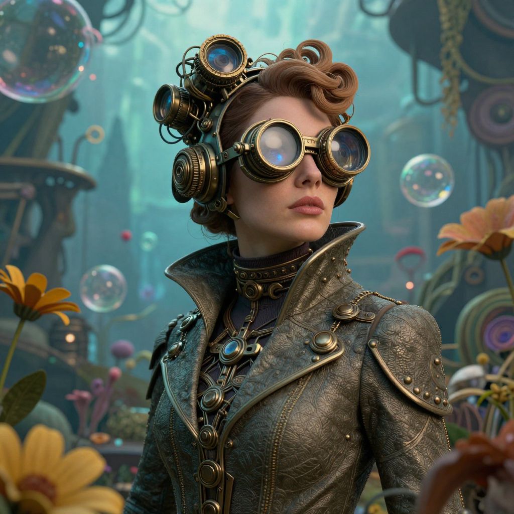 The image depicts a surreal, steampunk-inspired scene with a woman adorned in a futuristic, mechanical headpiece that resembles goggles with multiple lenses. Her hair is styled in intricate, curly locks, and she wears a high-collared, textured coat with metallic accents. The background features a blend of organic and mechanical elements, including floating bubbles, flowers, and architectural structures, creating a dreamlike atmosphere. The color palette is dominated by cool tones of blue and green, with pops of warm yellow and orange, enhancing the otherworldly feel of the scene. The composition is dynamic, with elements both in the foreground and background, creating depth and a sense of movement.