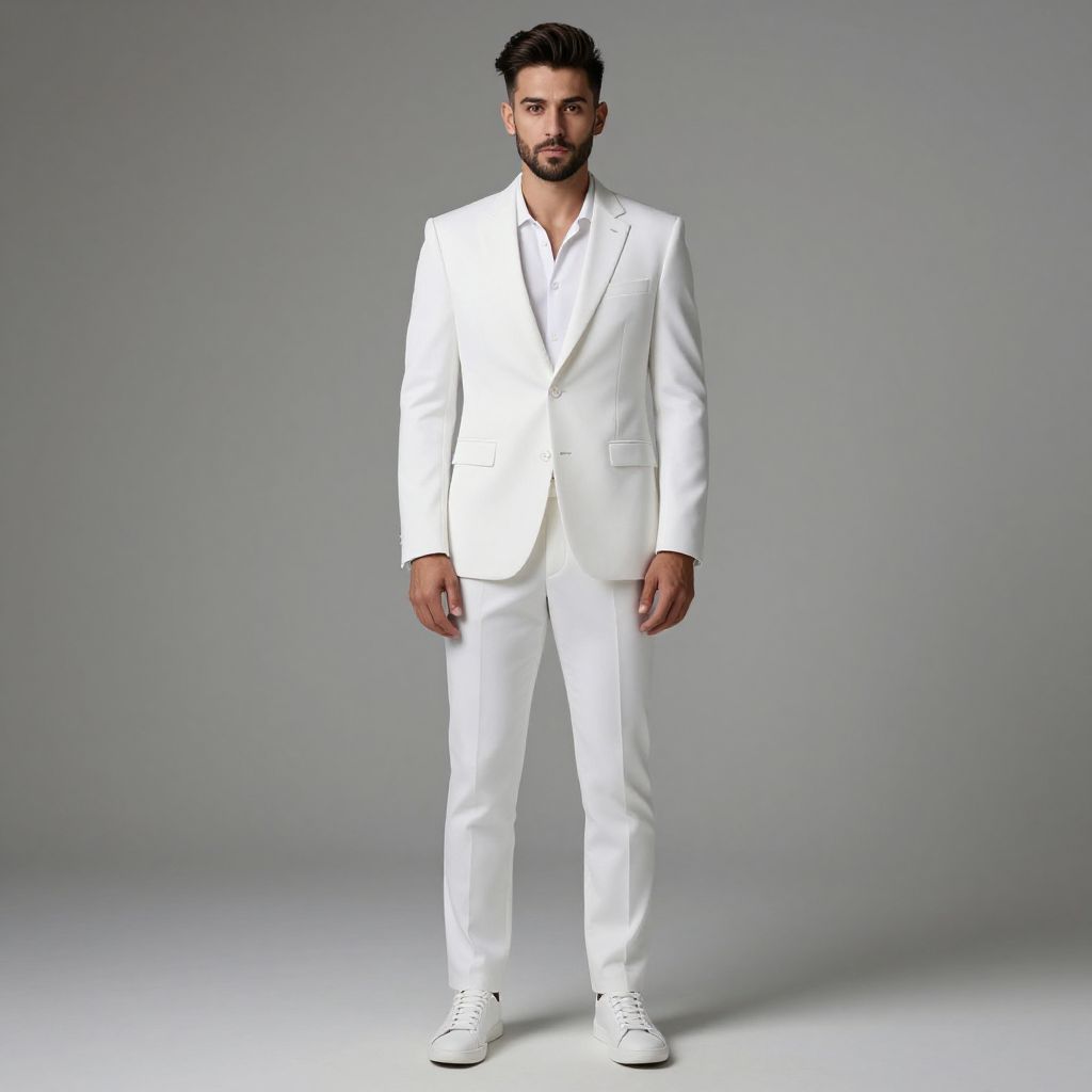A man stands confidently against a neutral gray background, dressed in a sharp, all-white suit paired with white sneakers. His styled hair and beard complement the modern, minimalist aesthetic of the tailored outfit, creating a clean and sophisticated look.