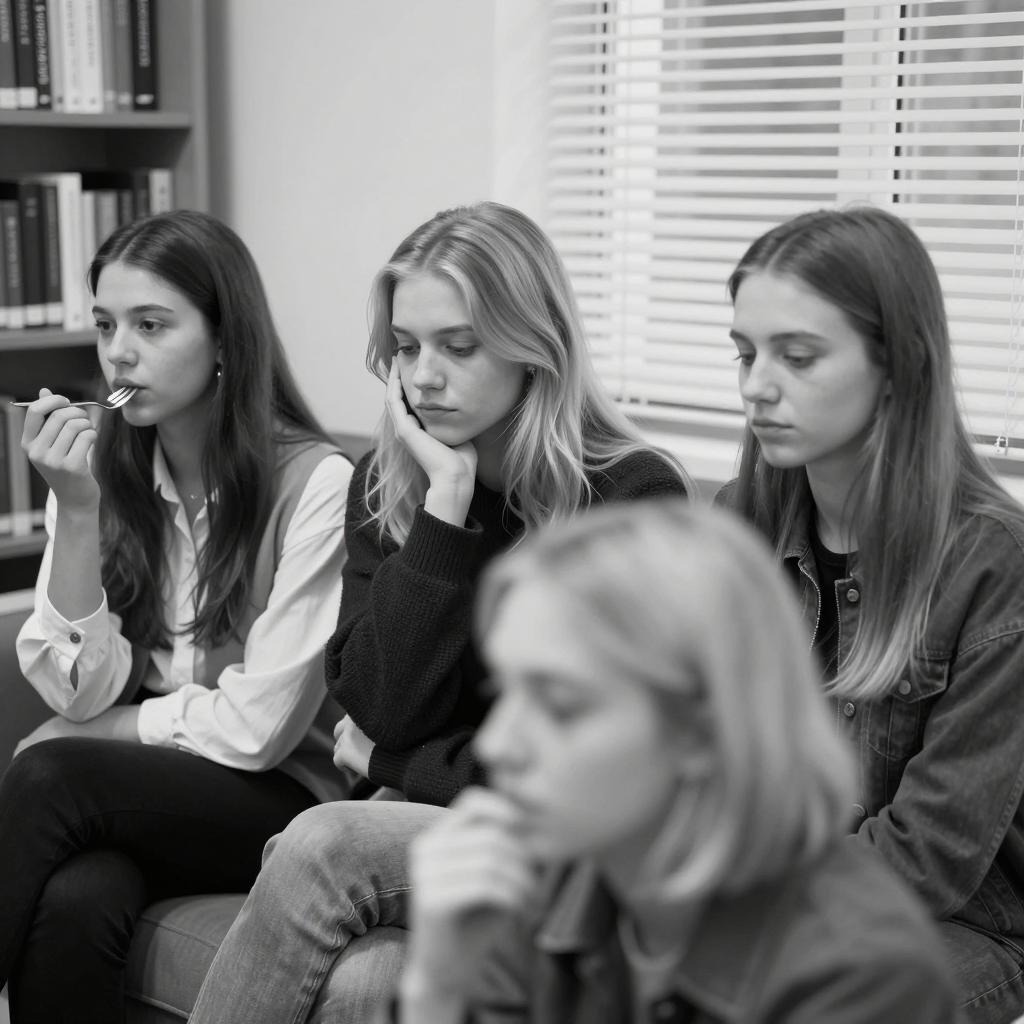 Black-and-white photograph of four young women sitting in a row. Leftmost woman with long dark hair, light blouse, and vest, eating with a fork. Second woman with medium-length blonde hair, dark sweater, hand on cheek, looking downward. Third woman with short blonde hair, blurred in the foreground. Rightmost woman with long blonde hair, dark jacket, looking down. Background includes bookshelves and window blinds.