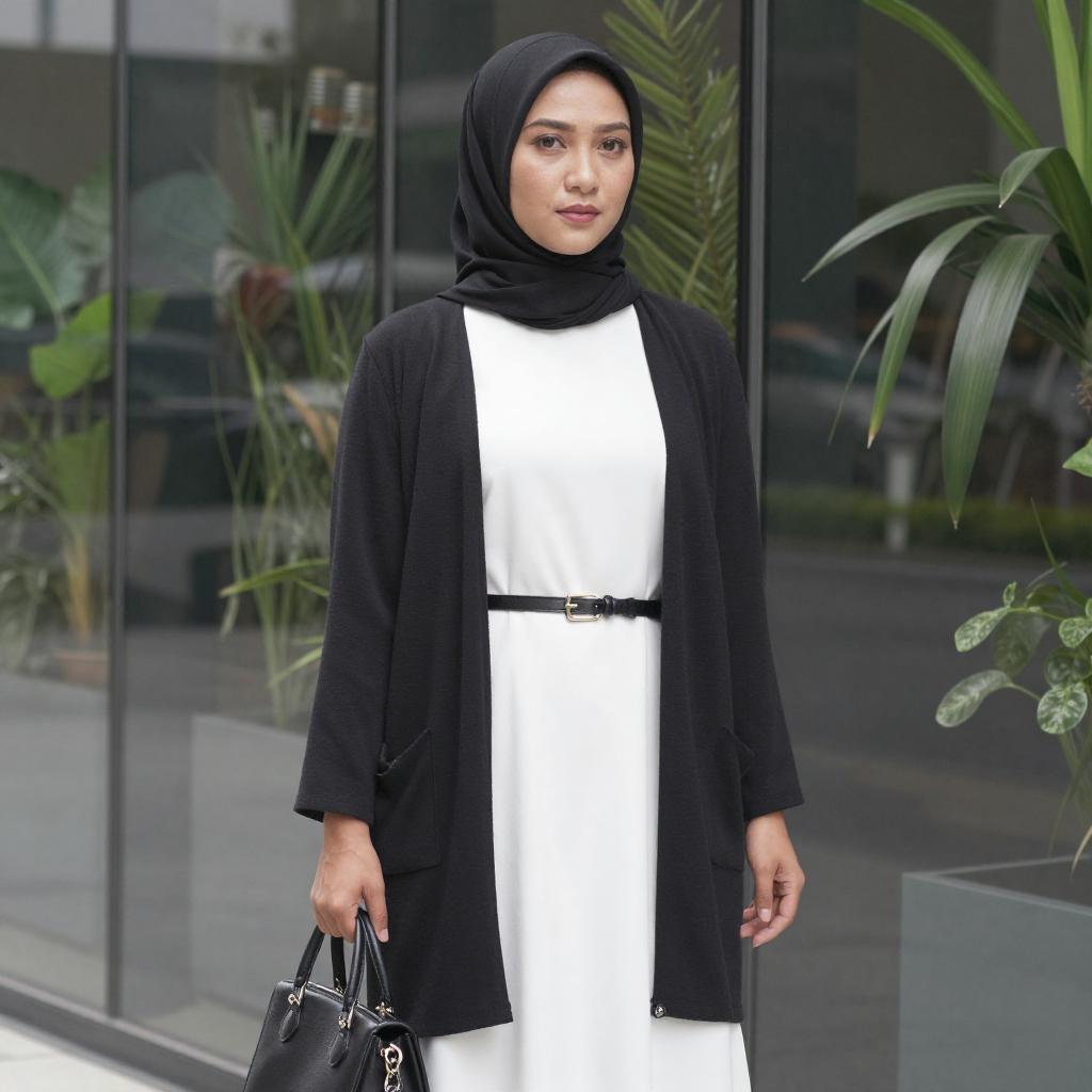 Photograph of an Asian woman with fair skin and black hijab, wearing a black satin blouse and blue high-waisted jeans. She stands in a tiled bathroom, hand on chest, next to a white sink with a white handbag and chain strap. Her reflection is visible in the mirror.