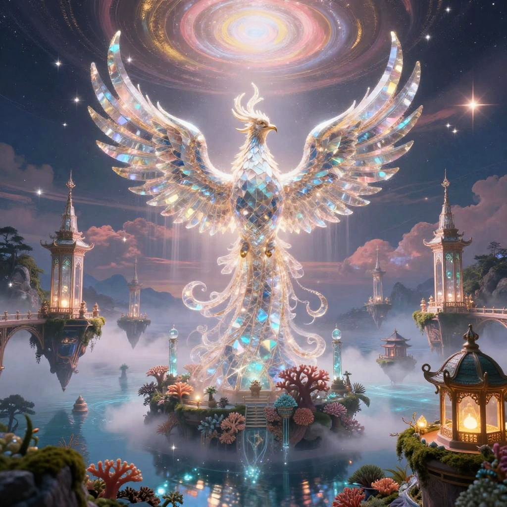 A giant crystalline phoenix rising majestically set within floating glass palaces above a glowing coral reef, wrapped in ethereal mist and drifting incense, glowing stars scattered above, a celestial vault painted with iridescent dawn hues with pastel pinks and gold streaks. Tranquil waters mirror the heavens, distant spires and bridges on rocky arches, lantern-lit sanctuaries and mossy terraces, a serene dreamlike atmosphere with surreal, intricate details; cinematic composition, volumetric fog and light rays, hyper-detailed textures, high dynamic range, wide-angle vista, depth of field, soft rim light, subtle film grain, epic scale.