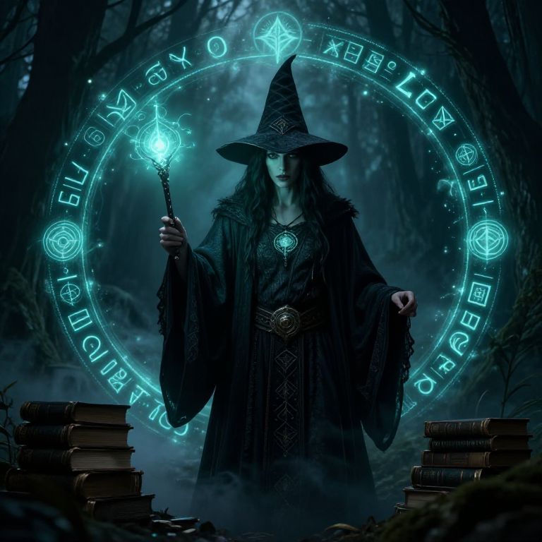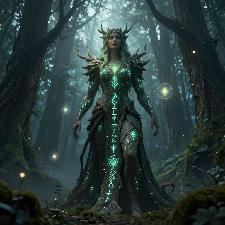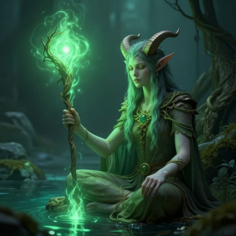 Dnd druid tiefling standing in a mystical forest, glowing green runes around, long flowing robes, intricate horns, ethereal aura, vibrant magical nature elements, fantasy art style