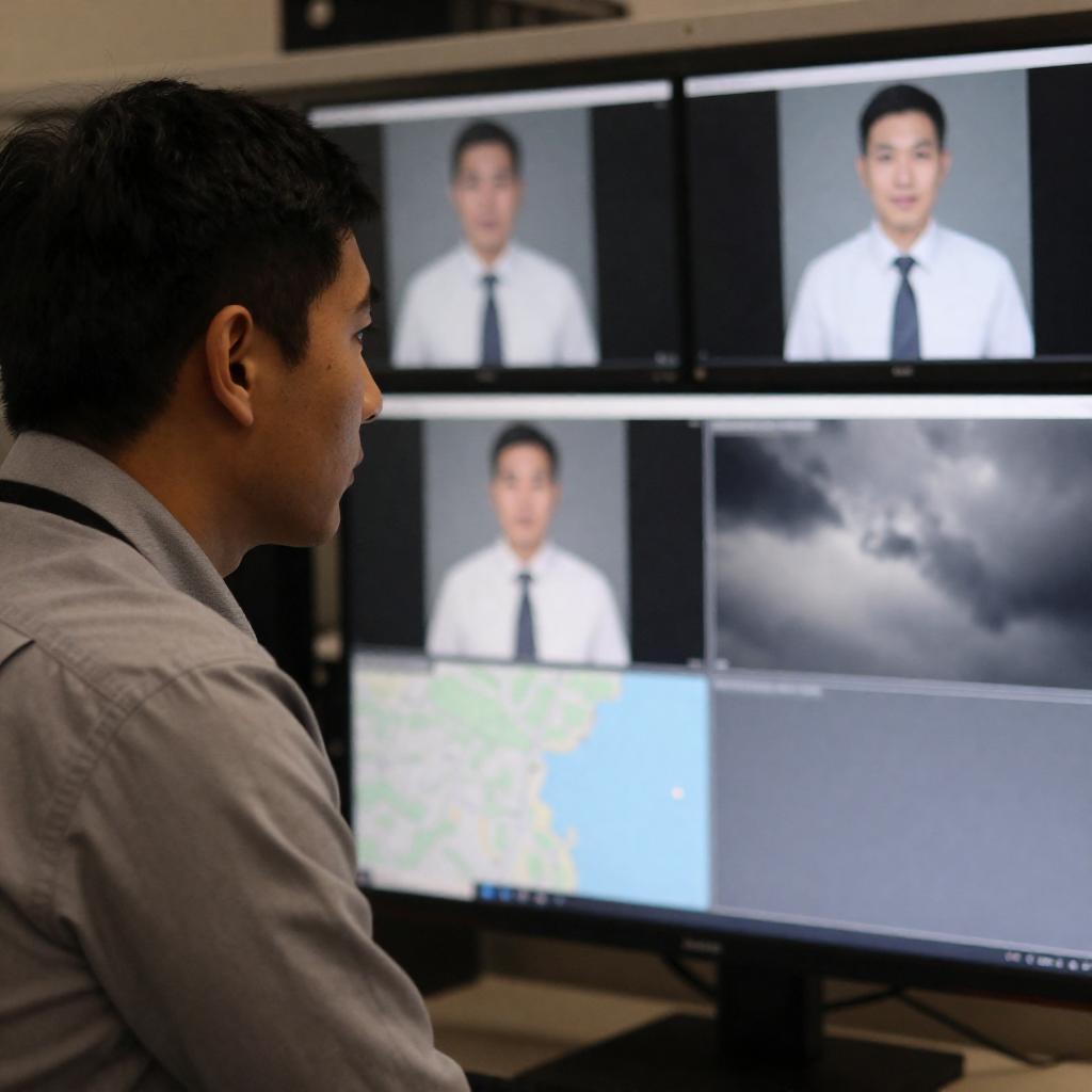 Photograph of a man with short dark hair, wearing a gray shirt, standing to the left, looking intently at a large monitor. The monitor displays multiple screens: one shows a man in a white shirt and tie, another shows a map, and a third shows a cloudy ure. Background includes metallic shelves and screens. The man's face shows concentration. Two additional smaller screens above the main monitor display the same man in a white shirt. Indoor setting, dim lighting.