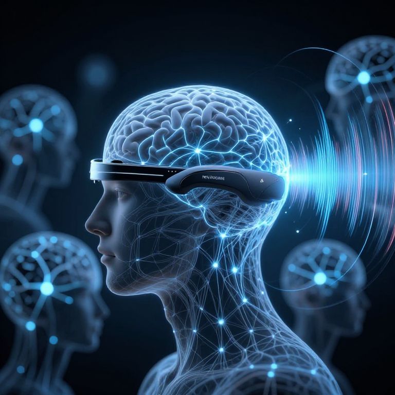 This digital CGI image depicts a translucent, blue-lit human head in profile, wearing a futuristic headband emitting a bright blue light from the right temple. The head is rendered in a wireframe style, highlighting the brain's intricate neural network. In the dark background, several blurred, semi-transparent human heads with similar blue-lit neural patterns float. The image conveys a sci-fi, technological theme, emphasizing brain-computer interface technology. The blue light and glowing lines create a futuristic, high-tech atmosphere, with a focus on the intersection of human and technology.