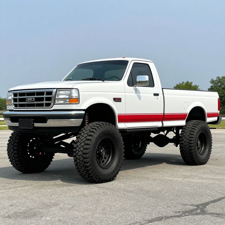 Lifted 1995 Ford F250 Supercab Longbed XLT 4x4 5-Speed Manual 7.3 Powerstroke Diesel truck parked prominently on a paved lot, featuring a striking two-tone paint scheme of white and red, large off-road tires, and a raised suspension that emphasizes its rugged, customized design.