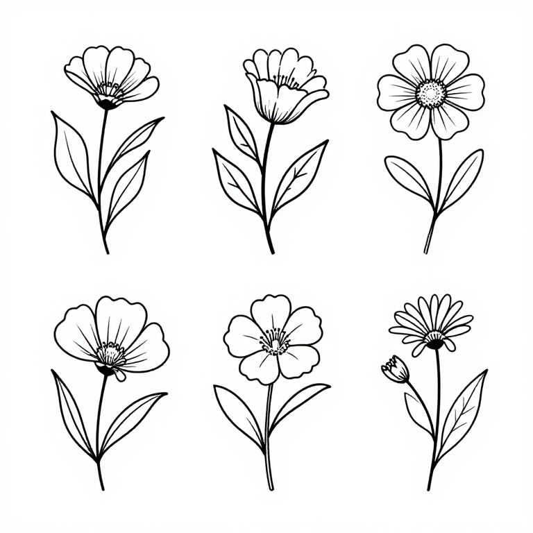 Simple black line drawings of various flowers and botanical elements, showcasing fine details with graceful curves and minimal color, arranged in balanced compositions on a blank canvas, promoting a clean and organic look.