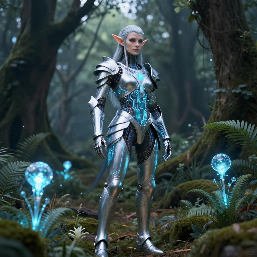 Elf AI standing in a mystical forest, blending futuristic technology with ancient elven magic, glowing circuits integrated into elegant silver armor, bioluminescent plants illuminating the scene, ethereal atmosphere, detailed digital art