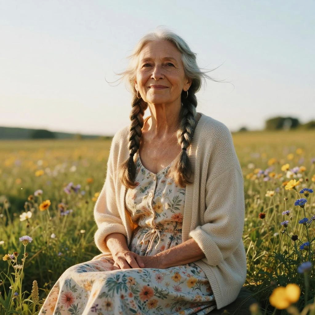 Photograph of an elderly woman with long, silver-blonde hair in a braid, sitting in a sunlit meadow filled with colorful wildflowers. She wears a cream-colored, knitted cardigan over a floral dress with a beige base. Her skin is fair, and she has a serene smile, looking into the distance. The background features a clear blue sky and a blurred, expansive field. The sunlight casts a warm glow, highlighting her gentle features and the texture of her cardigan. The image conveys a sense of peace and natural beauty.