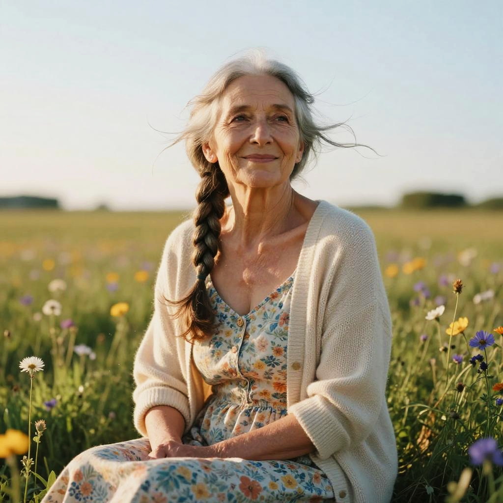 (masterpiece:1.1), best quality, (photorealistic:1.2), hyperrealistic, award-winning portrait of elderly woman, long gray hair braided, serene smile, upper body, expressive eyes, slim wai BREAK 1.1, wide hips:1.1, athletic-curvy build, wind-swept hair, sitting in wildflower meadow under clear skies, wearing light knitted cardigan and floral dress, golden hour glow, dappled light, soft particles in the air, 8k, highly detailed, broad lighting, chromatic aberration, subtle film grain, ray tracing, octane render, soft bloom