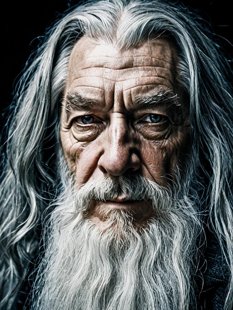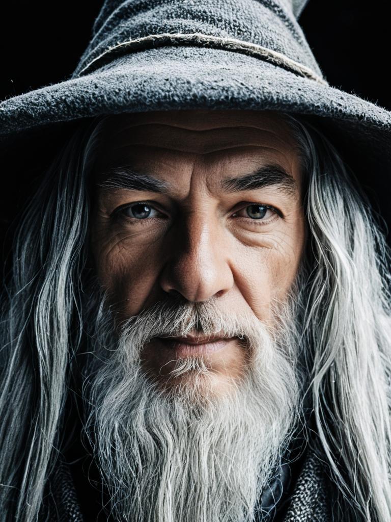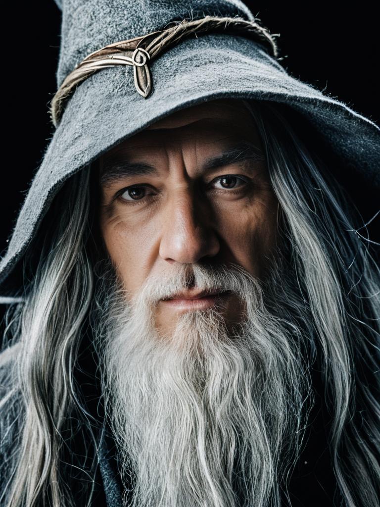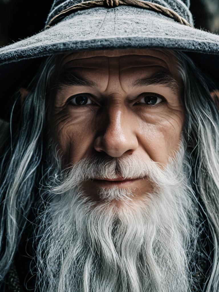 Man in Gandalf costume, close-up detailed headshot with sharp textures