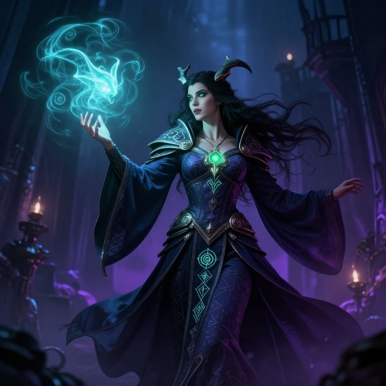 Epic female warlock DnD character summoning a spectral familiar in a shadowy gothic castle, detailed robes with arcane symbols, glowing green eyes, swirling magical smoke and floating runes, dark fantasy art style with vivid colors and dynamic pose