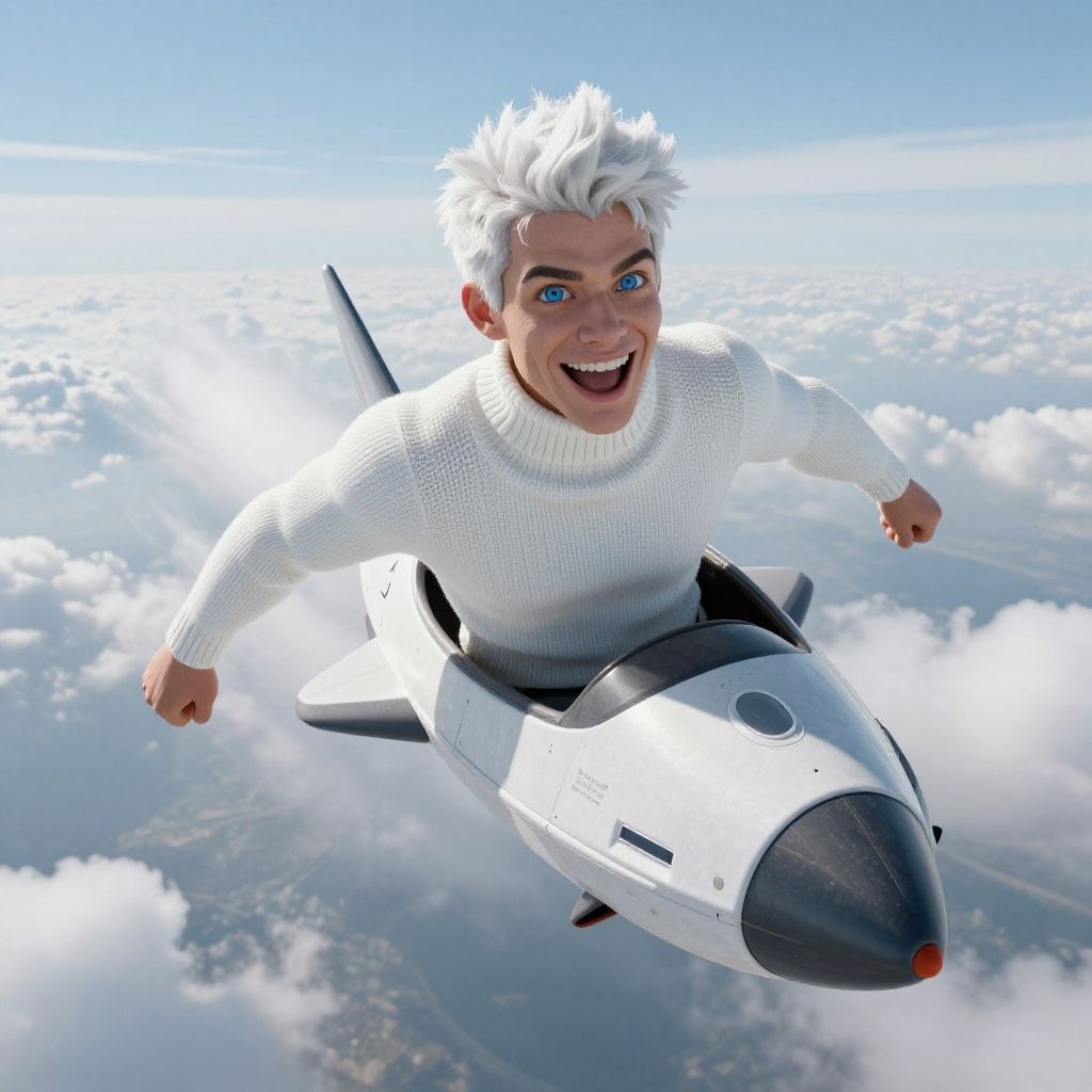 Full body shot, realistic photo of Malkosinuter, a young man with short white hair and deep blue eyes, soaring through the sky in a futuristic vessel that blends elements of a mini rocket. He showcases cyber enhancements, adding a high-tech, sci-fi element to his look. Wearing a white turtleneck sweater made from advanced textile, his expression is one of excitement and joy, with a broad smile. Highlight the clarity and intensity of his deep blue eyes and the modern, unique texture of the sweater. The backdrop of clouds and the vast sky emphasizes the exhilaration of high-speed, high-altitude travel, underlining his adventurous and cutting-edge style.