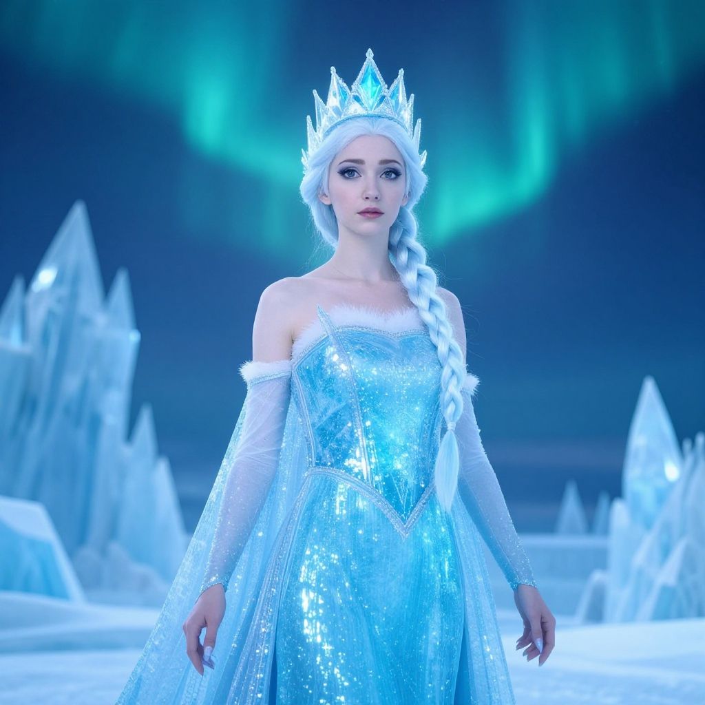 Photograph of a young woman with fair skin and icy blue eyes, standing in a snowy, ice-encrusted landscape under a vibrant aurora borealis. She wears a shimmering, silver-blue ice queen gown with off-the-shoulder sleeves, and a crystal crown adorned with ice-like accents. Her long white hair is braided on the left side. The background features jagged ice formations and a glowing blue sky. Her makeup is subtle, with pale pink lipstick. The overall scene has a magical, ethereal quality, emphasizing her regal, frosty appearance.