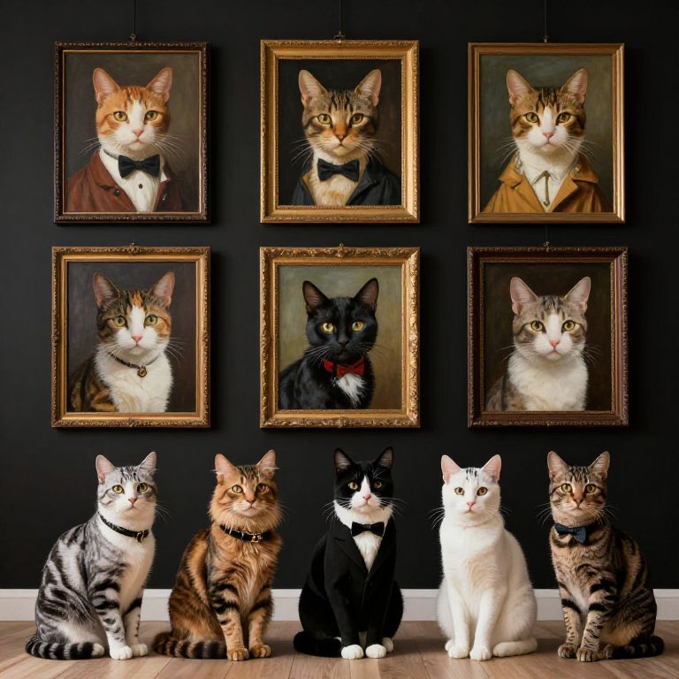 Photograph of six framed cat portraits on a black wall, arranged in two rows of three. Each cat wears a bow tie and sits in a different colored coat or collar, resembling formal portraits. The cats exhibit various fur patterns: striped tabby, tortoiseshell, black, and white. The frames are ornate gold. Below, six live cats, identical in appearance to their portraits, sit in a row on a wooden floor, mirroring the poses and attire of their framed counterparts. The image blends realism with a whimsical, almost surreal quality.