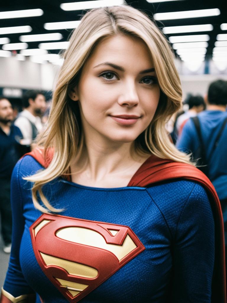 Woman in Supergirl costume, candid cosplay portrait at comic convention