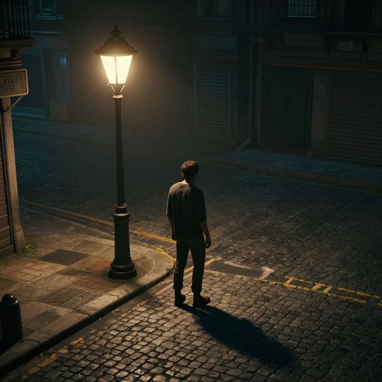 An atmospheric 3D-rendered scene depicts a solitary figure standing on a cobblestone street, illuminated by a vintage streetlamp casting long shadows, evoking a nostalgic and contemplative mood reminiscent of cyberpunk aesthetics.