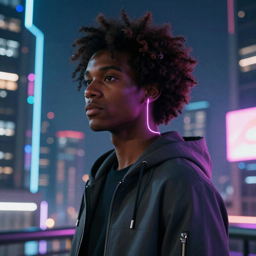 Dread head character in futuristic cyberpunk setting, glowing dreadlocks with neon highlights, sleek high-tech armor, reflective cityscape with holograms, moody atmosphere, cinematic composition