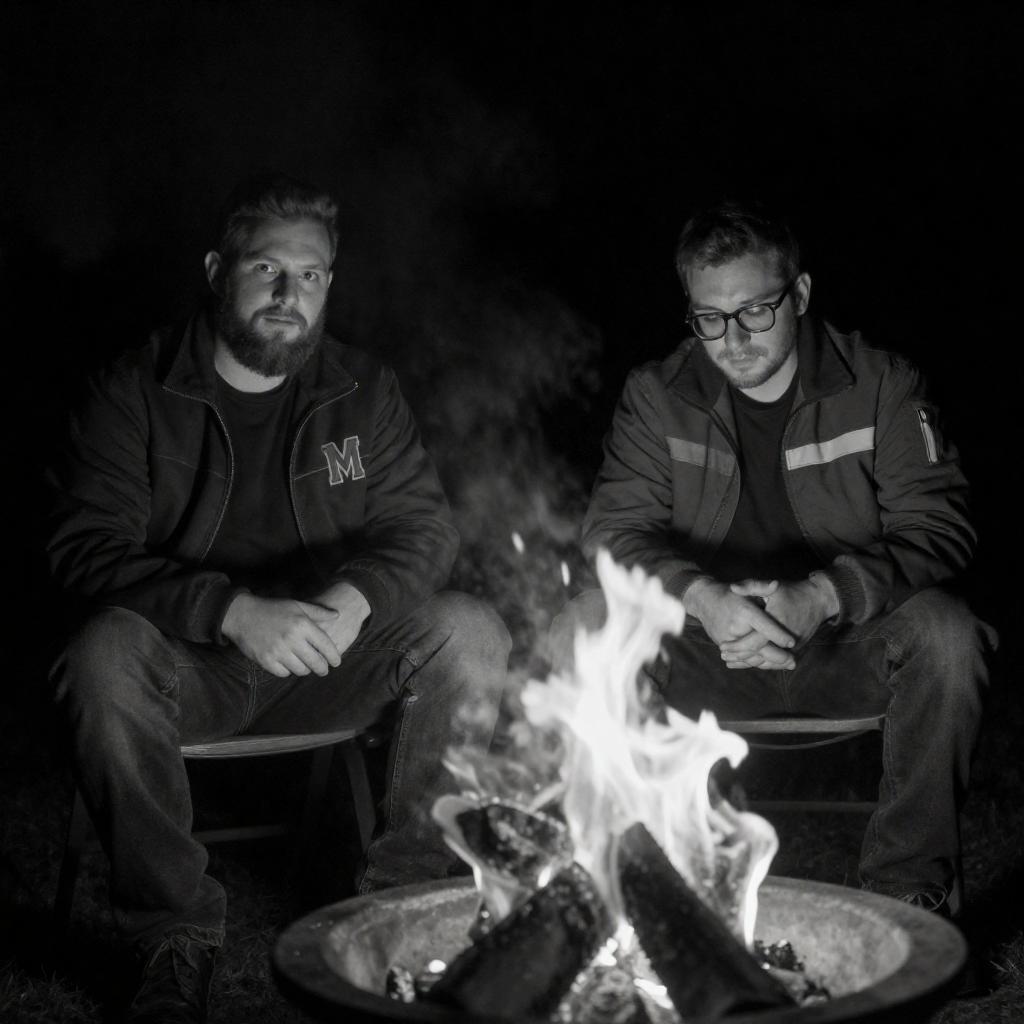 Photograph of five men around a wooden table in a rustic, dimly-lit room. Four men seated, one leaning back in a chair. Warm lamp above, fireplace in background. All men in casual clothing. One man with raised hand, smiling. Plates, bottles, and glasses on table. Wood-paneled walls.