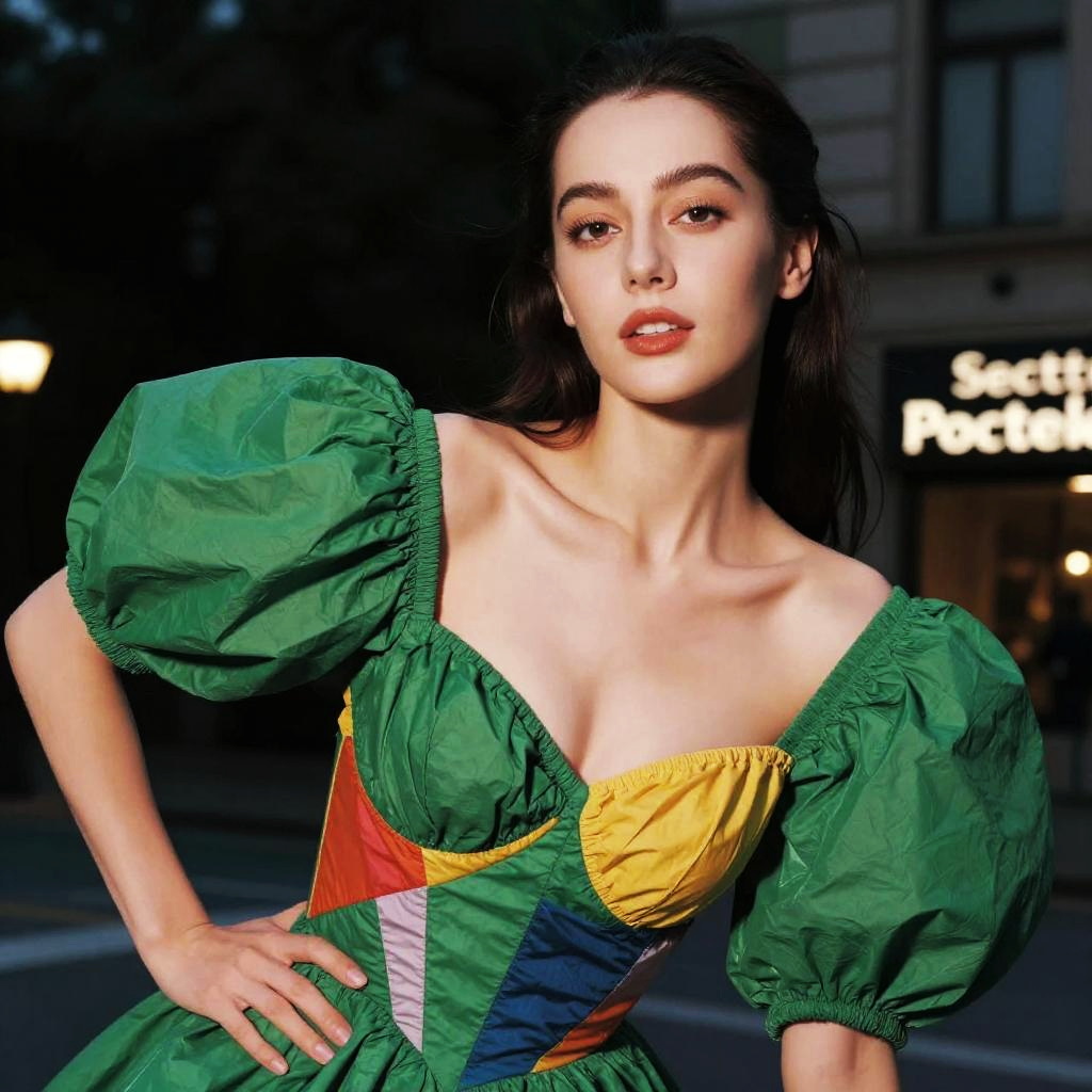 Woman posing for a photo, (wearing puff_dress, wearing colorful_dress:1.3), green puff_dress, good hand, 4k, high-res, masterpiece, best quality, head:1.3, ((Hasselblad photography)), finely detailed skin, sharp focus, (cinematic lighting), collarbone, night, soft lighting, dynamic angle, [:(detailed face:1.2):0.2], (((5 stars hotel))), outside