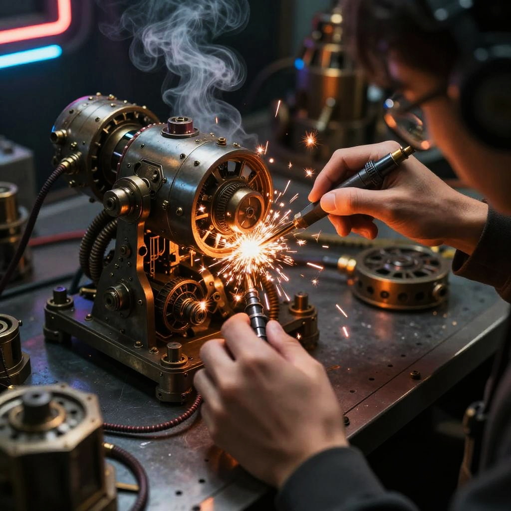Gadget mechanic repairing a high-tech mechanical device, sparks flying, neon lighting enhancing the industrial atmosphere, close-up of hands and complex gadgets, steam punk influence