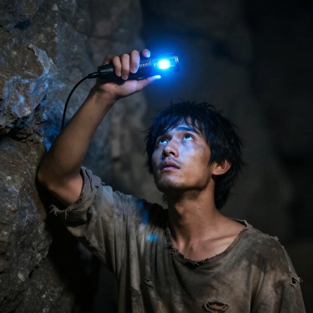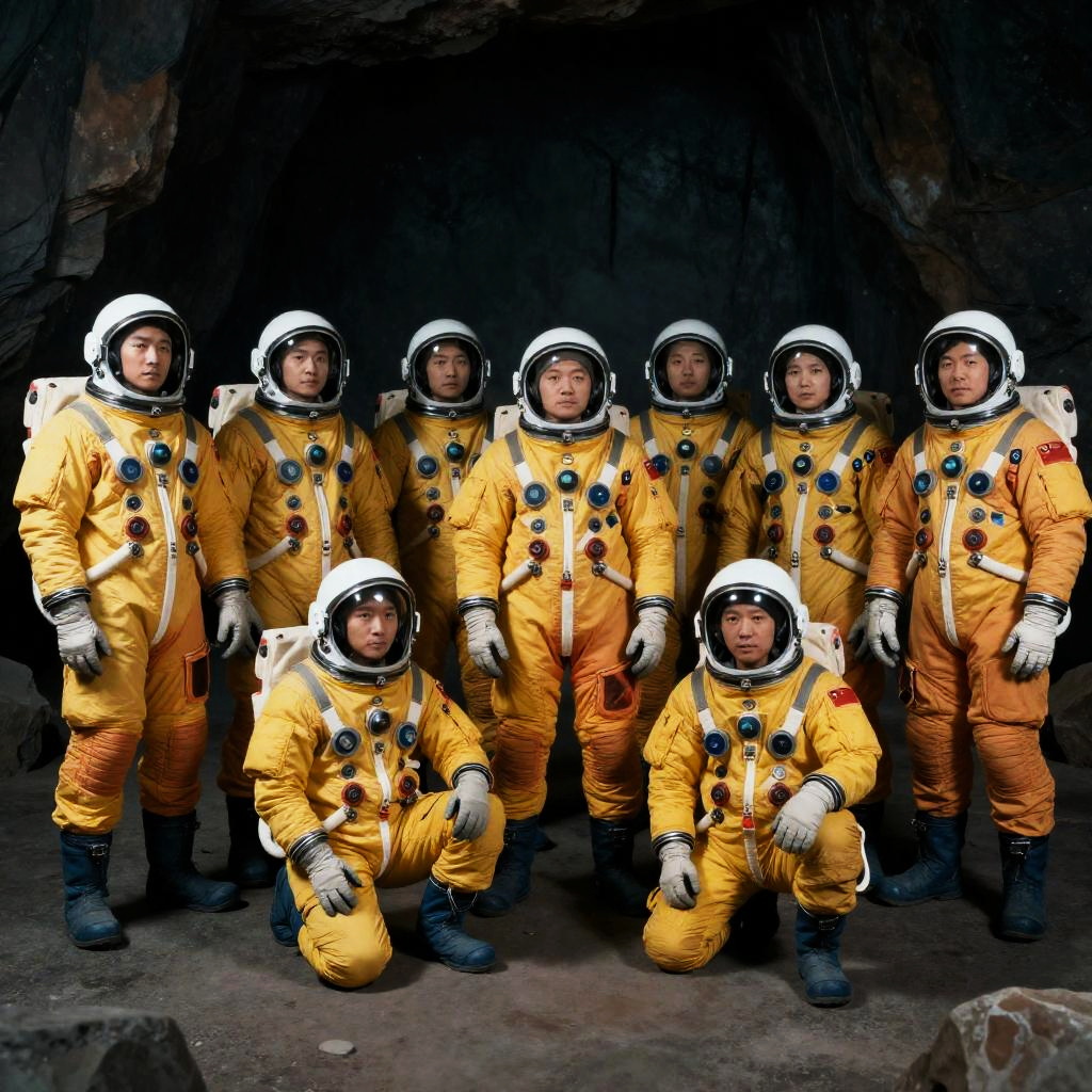 Photograph of four cavers in a dark cave. Three women and one man wearing scuba gear, helmets, and lights. They hold flashlights, casting beams of light. Cave walls and rocky floor visible. Three women in blue and red outfits, one man in beige. Intense expressions, crouching and standing. Green and yellow light reflections in the background.