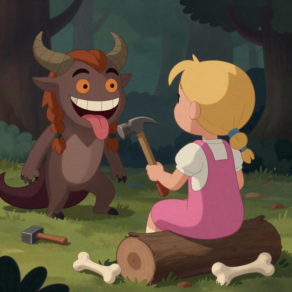 Cartoon of a blonde girl in purple overalls and pink shirt, hammering a dragon-like creature with braided hair. Hammer on ground, black bucket nearby. Dragon's face shows annoyance. Girl smiles. Dark background. Two characters. Bright colors.