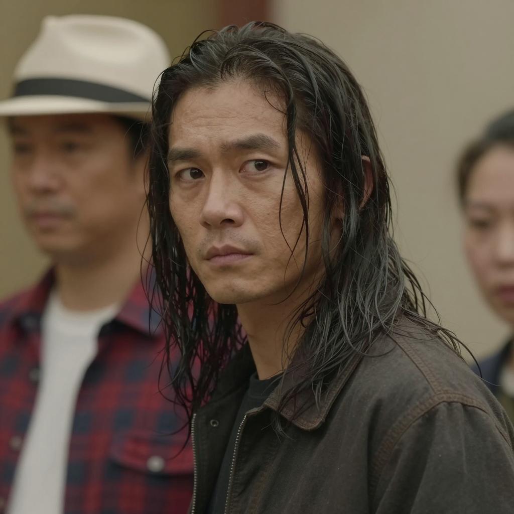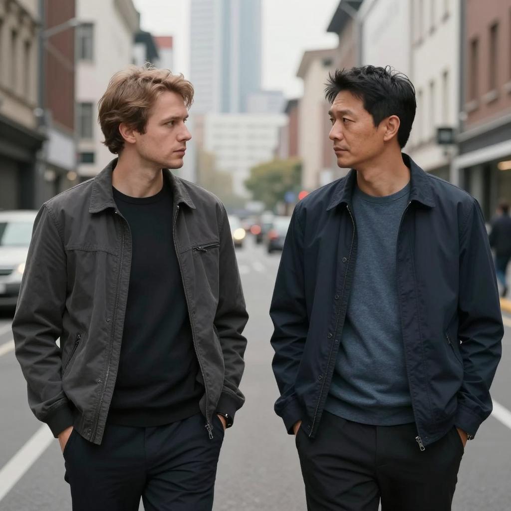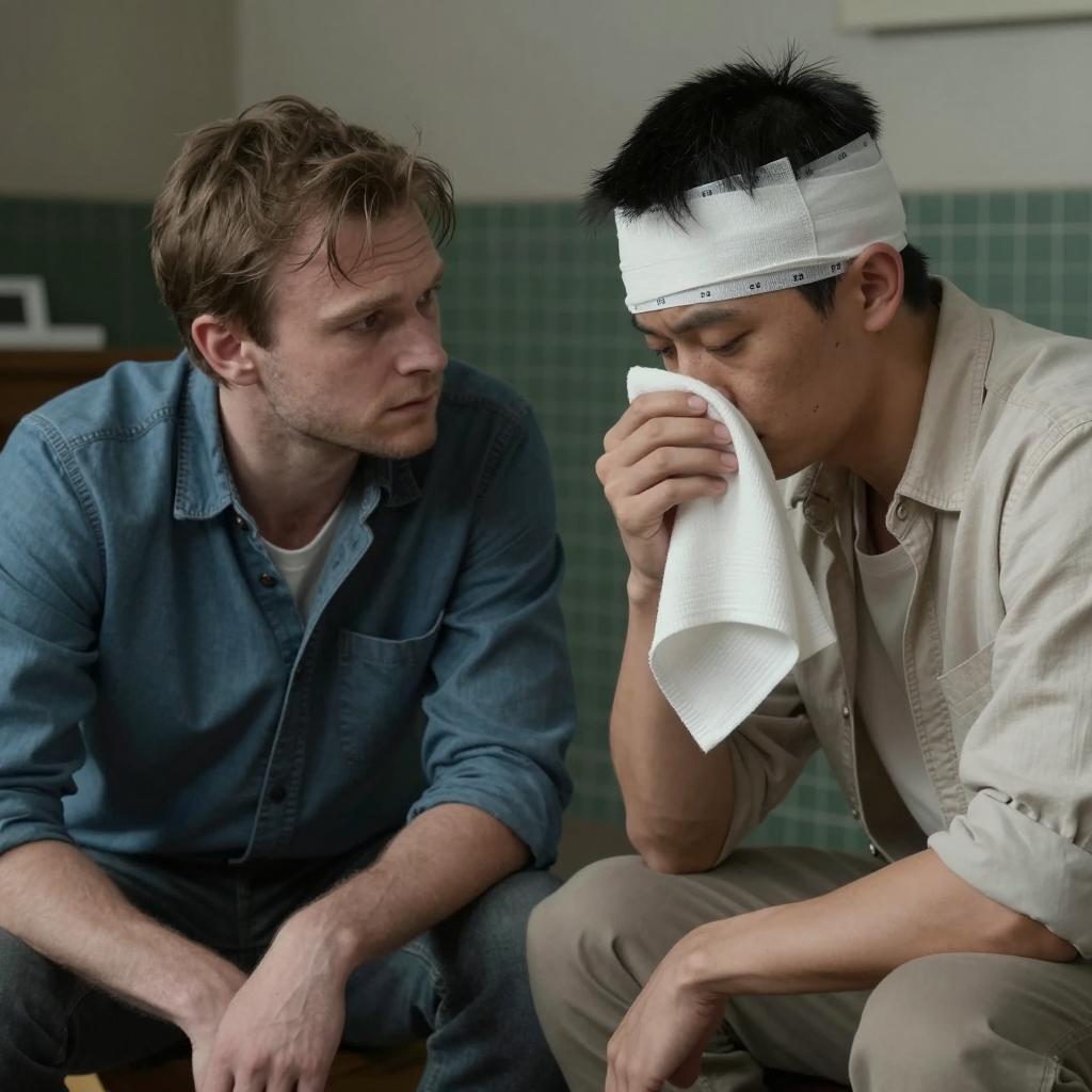 Two men in a dimly lit room. The man on the left has short brown hair, a blue shirt, and a determined expression. The man on the right has bandages on his head, a beige shirt, and holds a white cloth to his face while looking down. They are crouched close together, with a green wire mesh in the background.