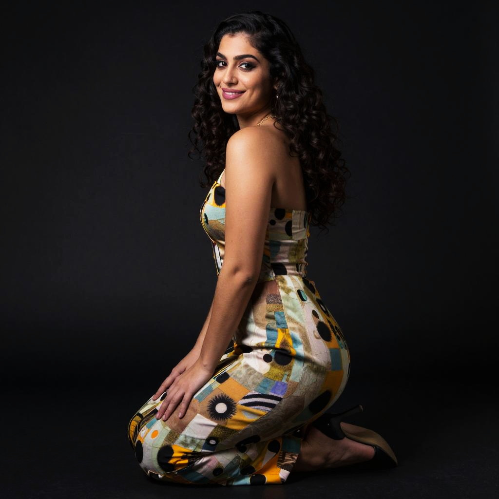 Photograph of a smiling woman with curly black hair, kneeling on a black background, wearing a colorful, strapless, geometric-patterned dress.