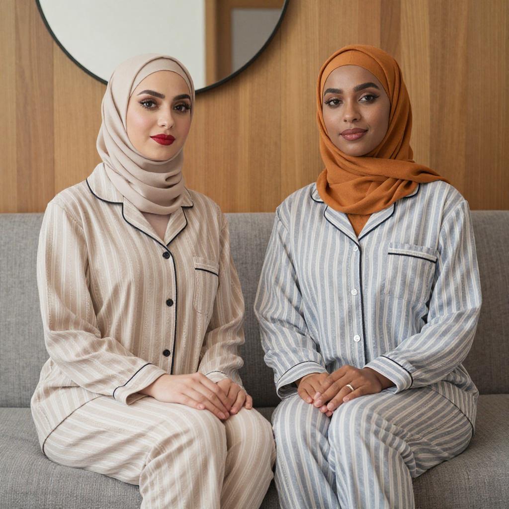 Photograph of two women sitting on a gray couch. Both wear matching striped pajamas and hijabs; one in beige and the other in orange. The woman on the left has a light complexion and red lipstick, while the woman on the right has a slightly darker complexion and neutral makeup. The background features wooden walls and a circular mirror.