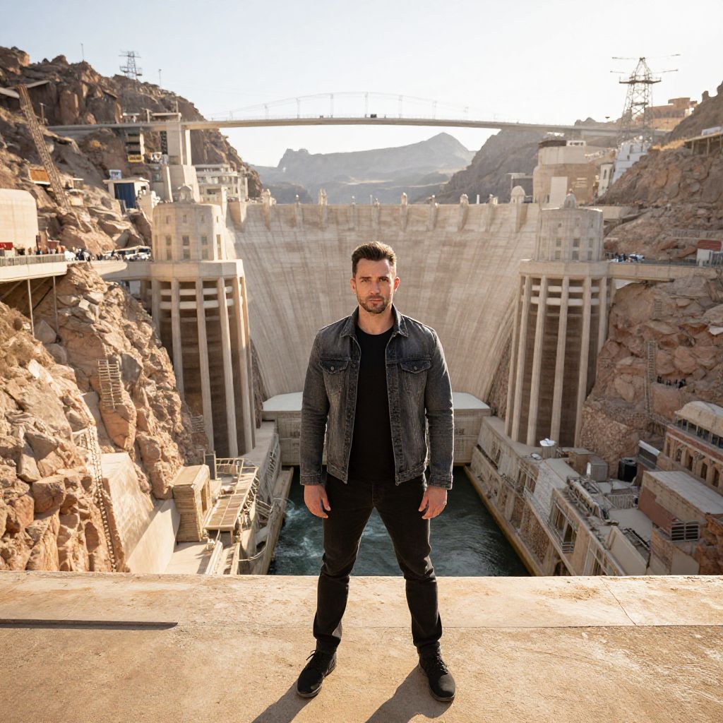 Powerful male figure stands proudly before iconic Hoover Dam, grandeur of concrete behemoth looming large behind him, capturing awe-inspiring perspective, vast expanse of water flowing beneath, golden hour sunlight casting dramatic shadows, serene landscape unfolding in the distance. Man has masculine face and piercing eyes