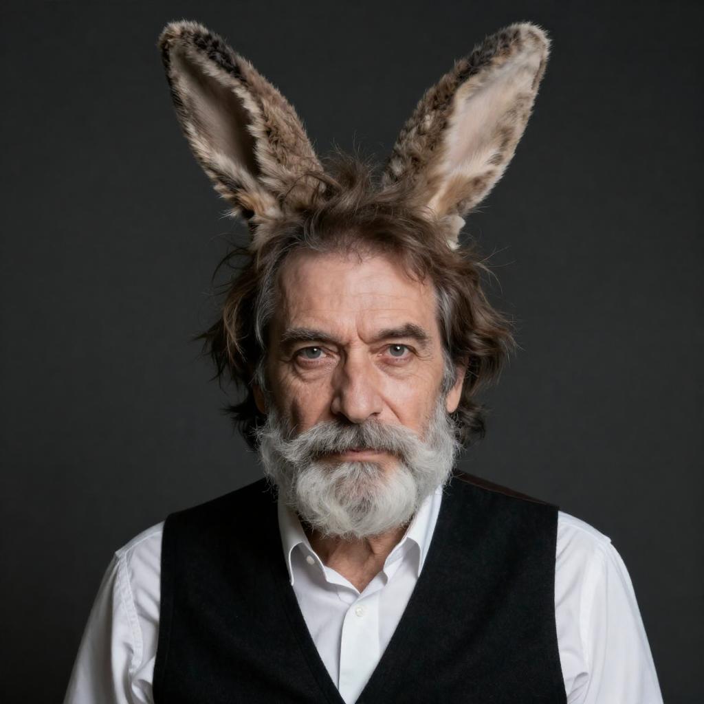 Whimsical Portrait of Elderly Man with Rabbit Ears