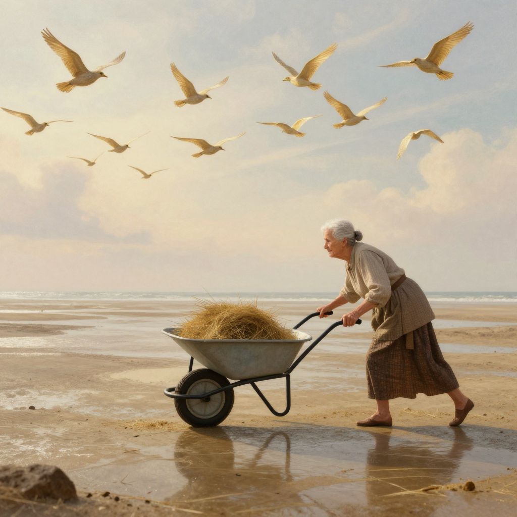 In a serene, vintage-inspired digital artwork, an elderly woman pushes a wheelbarrow filled with hay across a reflective, dried-up ocean surface, accompanied by a flock of ethereal, golden-toned birds soaring gracefully against a soft, impressionistic sky.