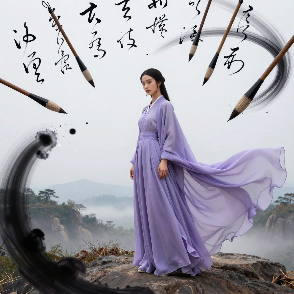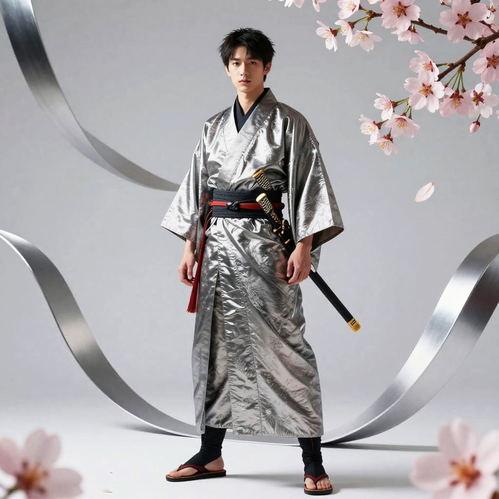 A surreal fashion scene of a samurai in modern metallic kimono, set against an epic landscape with abstract floating cherry blossom petals and steel ribbons, dynamic low-angle composition, bold curving lines, sophisticated and clean