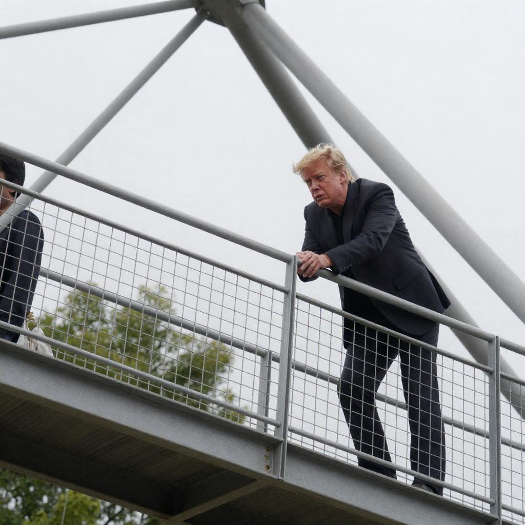 Photograph of a man with light blond hair, wearing a dark suit, leaning forward on a metal catwalk with grid railings. Background shows a large, angled steel structure with visible crisscross beams. Man's expression is intense, focused. Metal ures dominate. Overcast lighting. The catwalk is elevated, with greenery visible in the background. Man is positioned slightly to the right, extending his right arm forward. One person.