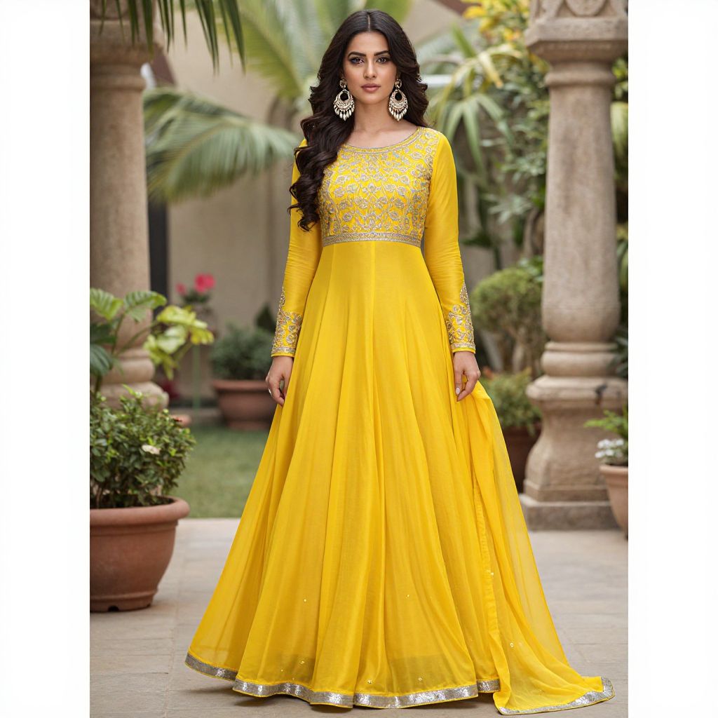 Photograph of a beautiful woman with long, wavy dark hair, wearing a vibrant yellow traditional Indian dress with intricate gold embroidery. She has a fair skin tone and is adorned with large, dangling earrings. The dress has long sleeves and a flowing skirt with a silver trim at the bottom. She stands in a lush, garden-like setting with potted plants and stone pillars in the background.
