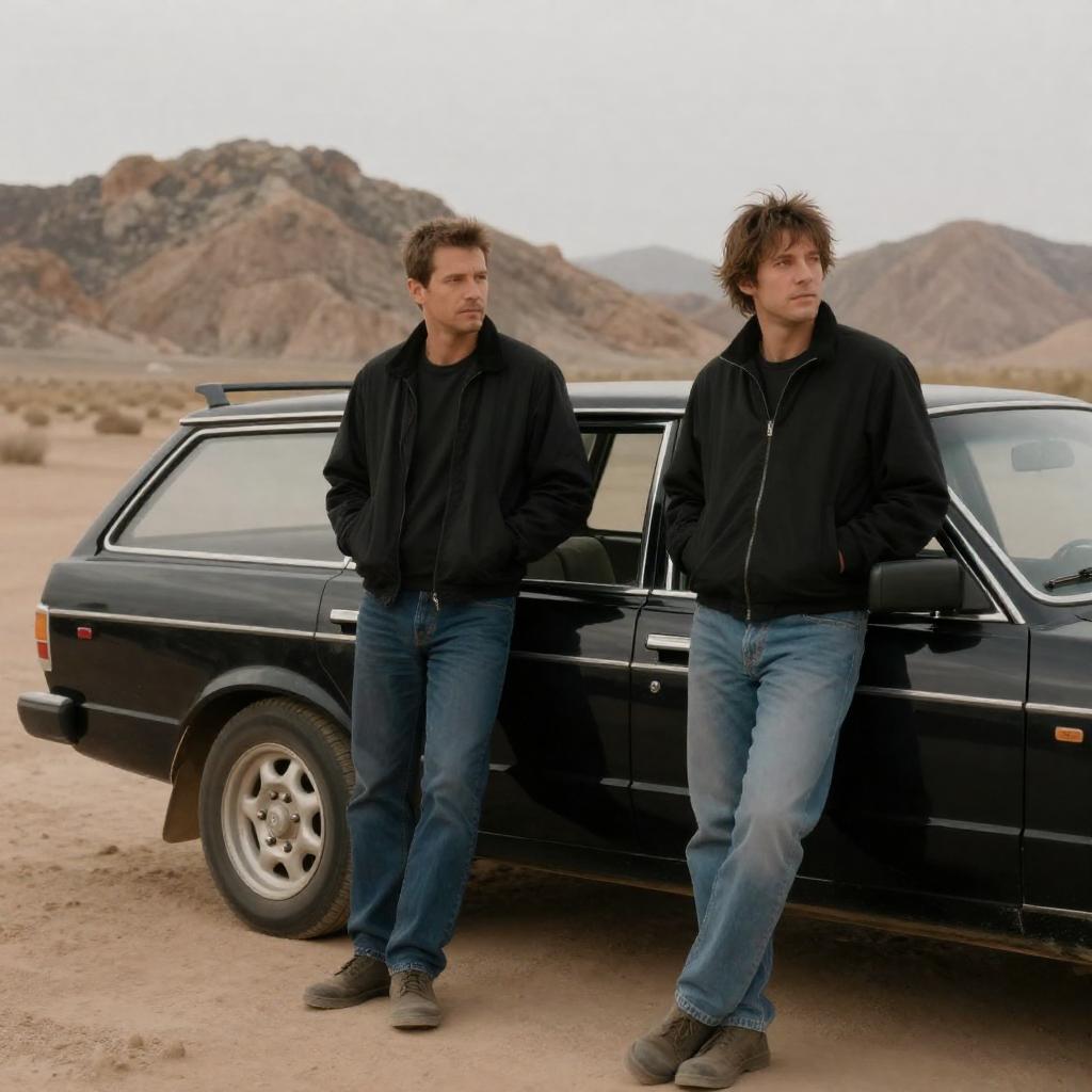 Black-and-white photograph of a street scene. A man with long hair, wearing a dark jacket, stands beside a classic car with its door open. Another man, in a hat and jacket, leans into the car. Background includes a striped awning and storefront signs. The car's shiny surface contrasts with the gritty urban setting.
